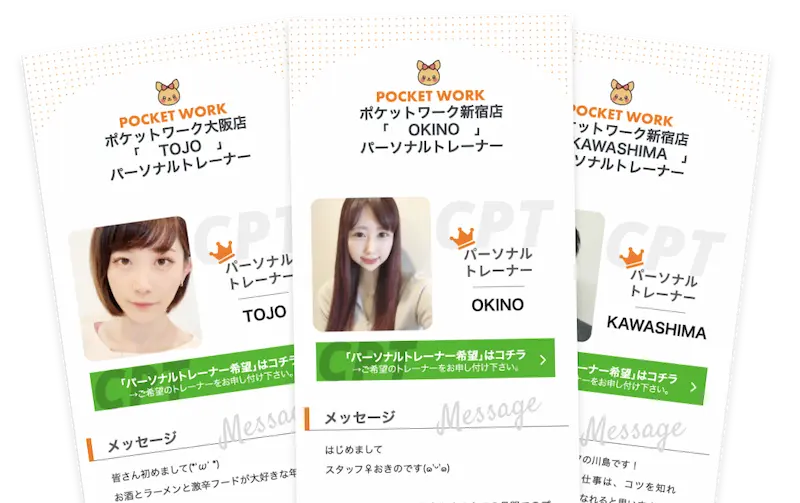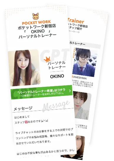 ポケットワークは24時間365日有人サポートです。スタッフはチャットレディ経験のある専任スタッフが全国(8拠点)で100名近く在籍しており、チャットレディとして働いた経験を生かした専門的なサポートが可能となっています。登録からお仕事に関することまで、チャットレディの皆様がより働きやすくなるようサポートさせて頂きます。スタッフと二人三脚でガッチリ稼いでいきましょう!